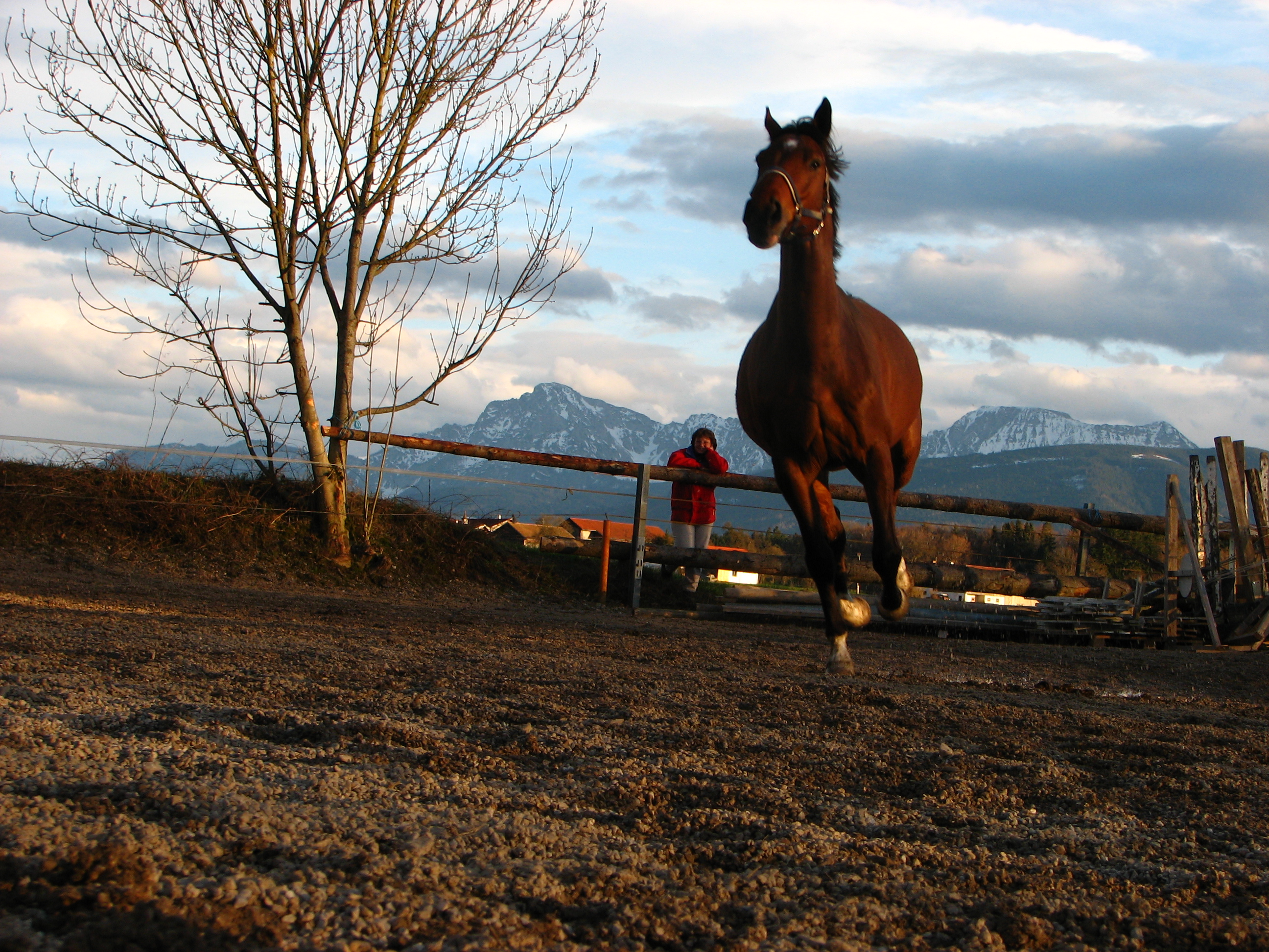 Unser Chip wurde im Jahr 2000 als Zwilling hier in unserem Dorf geboren. Er war ein Mischling aus Trakehner und bayerischem Warmblut (Vater). Mit seinem Bruder Shap wuchs er unbeschwert und in Fohlengesellschaft auf. Das ist äußerst selten, da bei Zwillingsgeburten oft eines oder gar beide Fohlen sterben.