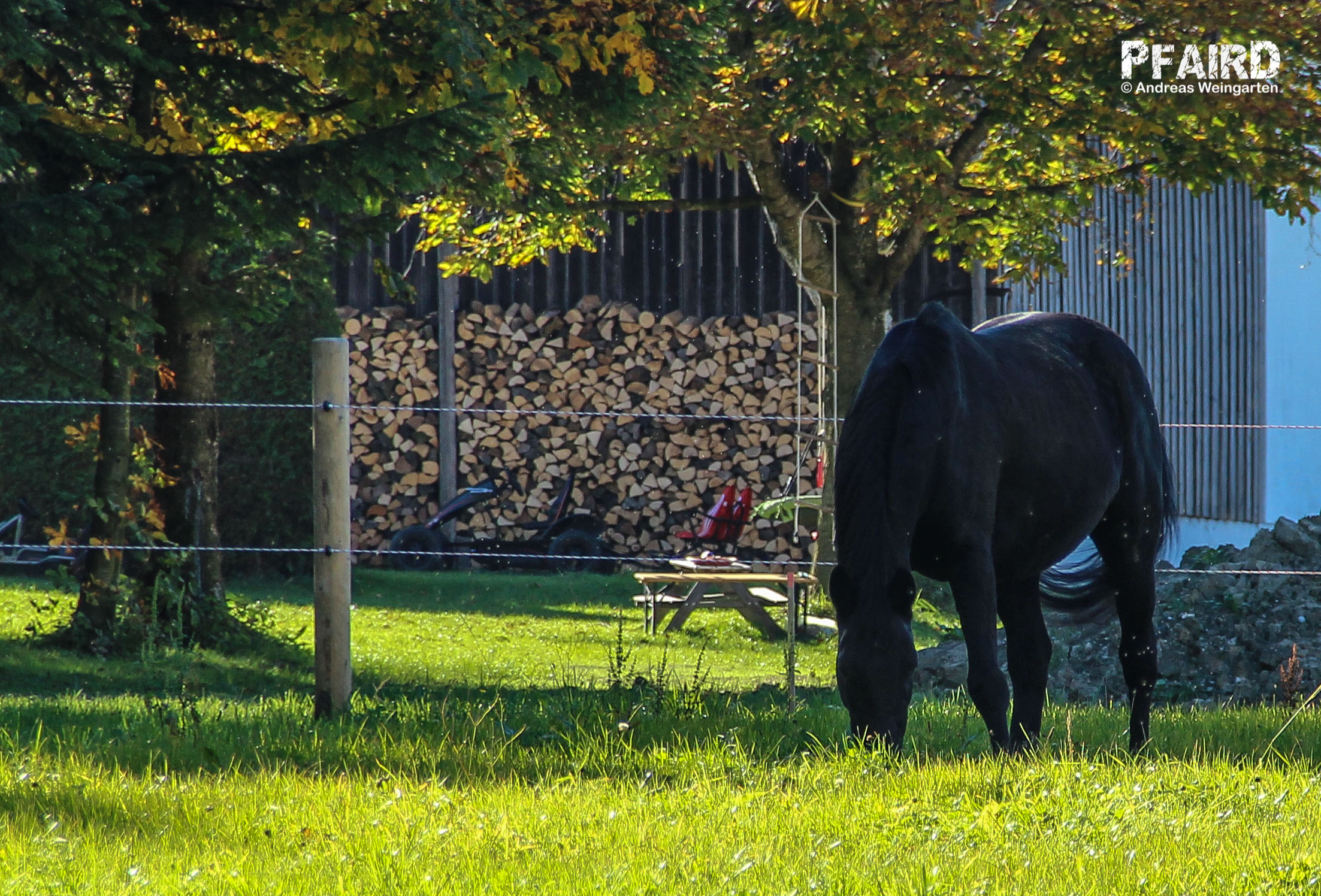 Wenn man die Pferde fragt (zum Beispiel durch die „Wahl“) sagen unsere immer „Gras zuerst!“. Die Weide ist ihnen sehr wichtig. Das Fressen in der natürlichen Bewegung und Position macht sie zufrieden. Das Auswählen der Pflanzen zum Fressen freut sie. Aber auch das Wälzen im Gras, das Ruhen und das Laufen. Aus diesem Grund haben wir - trotz sehr kleiner Flächen - immer wieder „Koppelgang“ im Programm. Wir zäunen dafür kleinere Parzellen aus (ohne tote Ecken und mit genügend Platz für alle drei!) und erweitern diese Koppel dann tageweise und witterungsabhängig bis die ganze Wiese zur Verfügung steht. Wir misten die beweideten Weisen täglich ab.