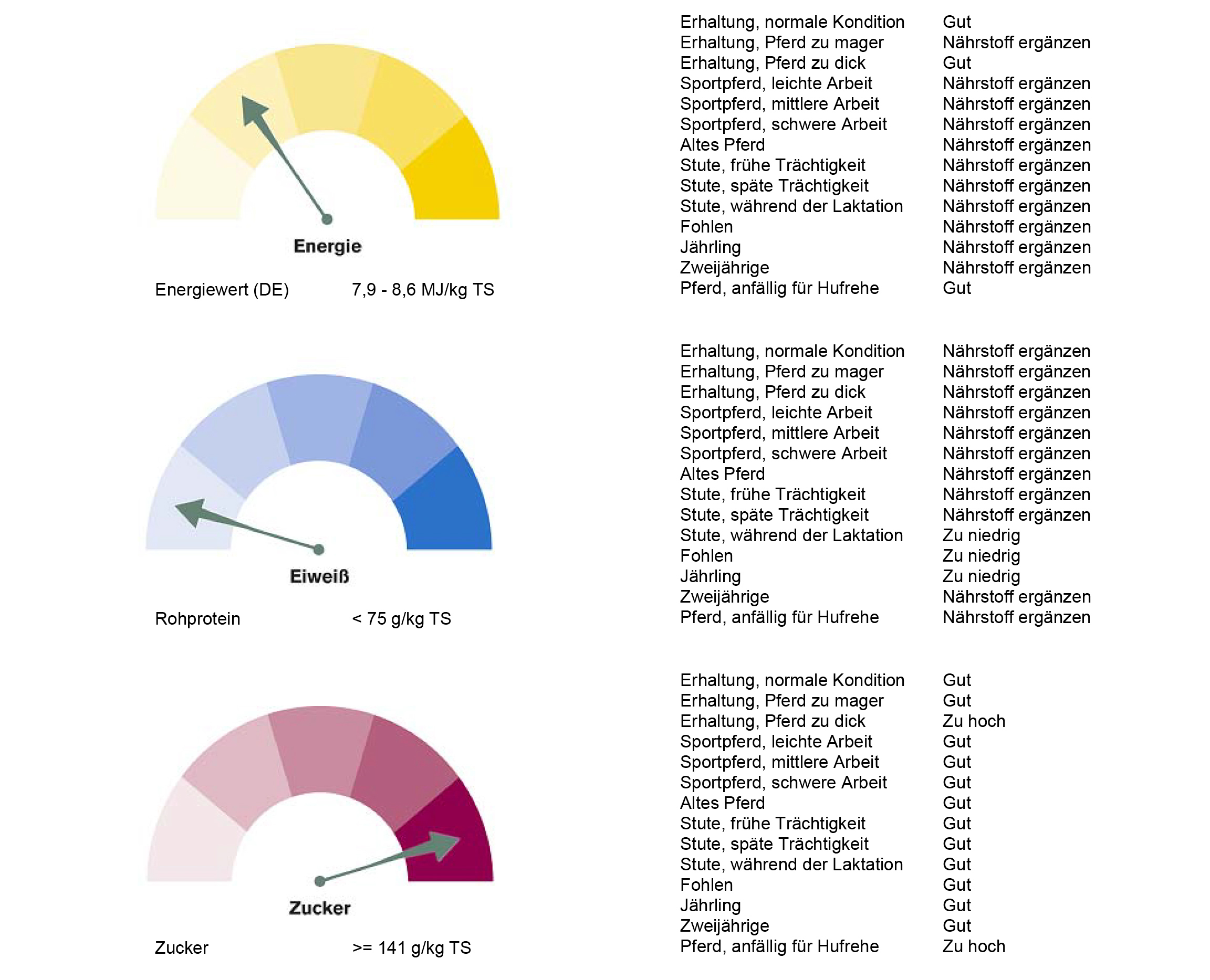 Das war doch überraschend. Das Heu von 2017 (hatten wir beim Einzug in den neuen Stall auf die Schnelle organisiert und gekauft und war ja auch sehr gut) hat im Schnitt mehr als 27% mehr Zucker als das diesjährige! Unsere Pferde haben also ein Jahr lang nun „Süßspeise“ konsumiert :o)) Auch der Energiegehalt war doch deutlich geringer! Super, das wird den Pferden nicht schmecken, aber die Figur wird es uns danken ;o) Na ja, ganz so ist es nicht, aber wir wissen nun, dass das Heu dieses Jahr etwas weniger auf die Figur schlagen wird.